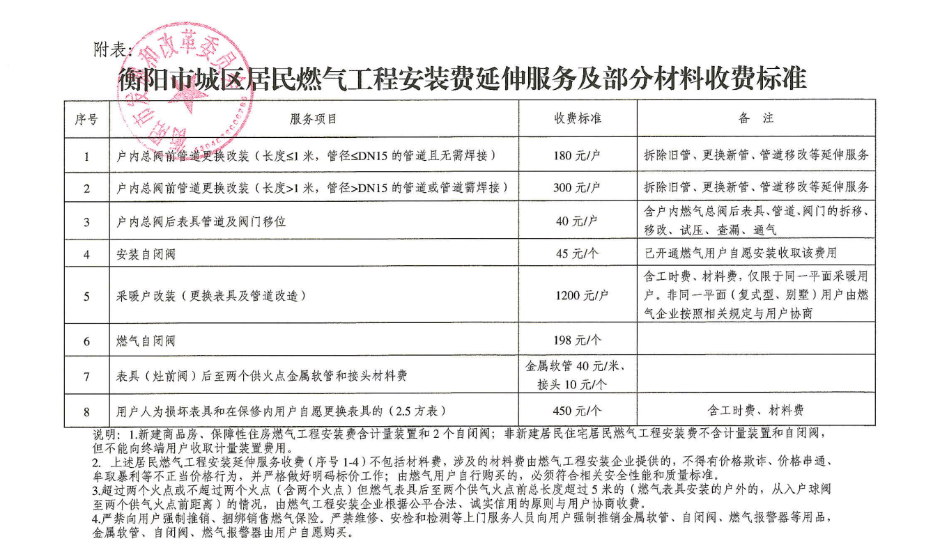 根據(jù)衡陽(yáng)市發(fā)展和改革委員會(huì)《關(guān)于規(guī)范市中心城區(qū)燃?xì)夤こ贪惭b收費(fèi)有關(guān)事項(xiàng)的通知》(衡發(fā)改價(jià)商〔2024〕2號(hào))文件規(guī)定: